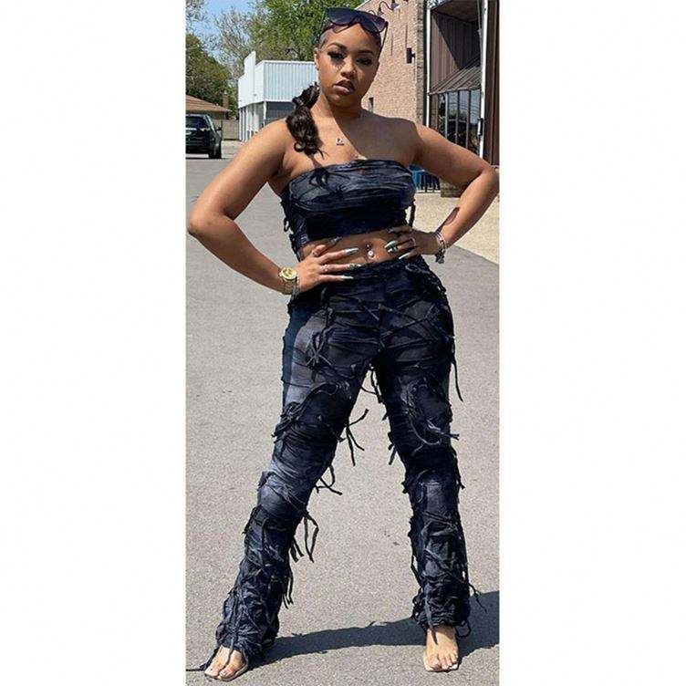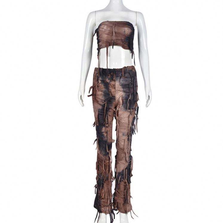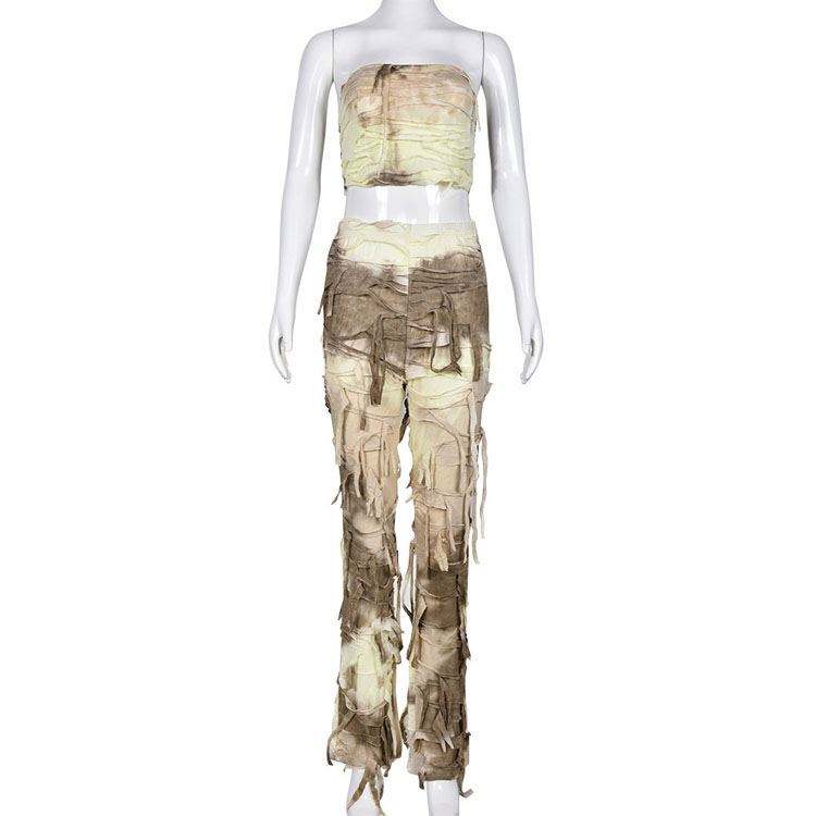 Nuovo Design 2024: Completo Donna Tie-Dye con Frange, Top a Fascia e Pantaloni Lunghi, Set Autunnale alla Moda