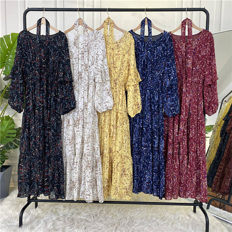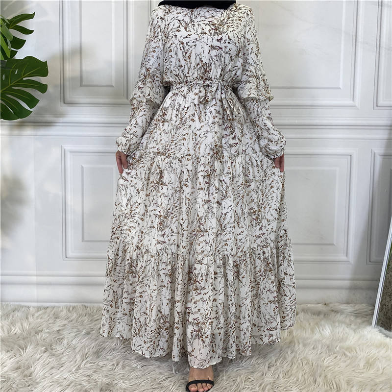 2024 New Muslim Long-sleeved Lined Chiffon Print Lace-up Women's Long Skirt Swing Dress