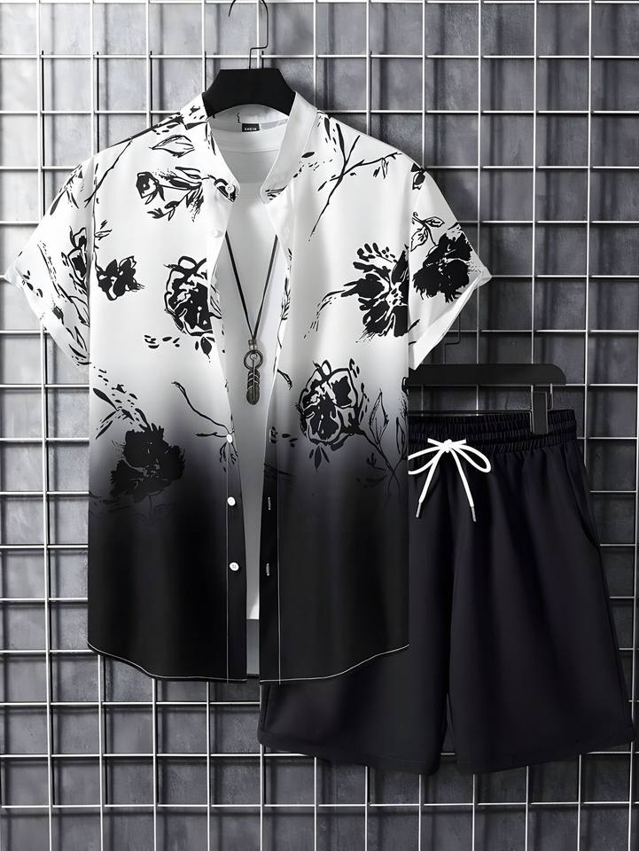 2024 Summer Beach Suits Men's Casual 2 Piece Set Short Sleeve Shirt + Shorts Loose Printed Elastic Waist Short Pants Suits