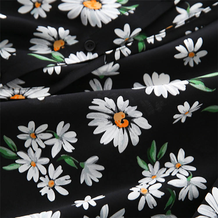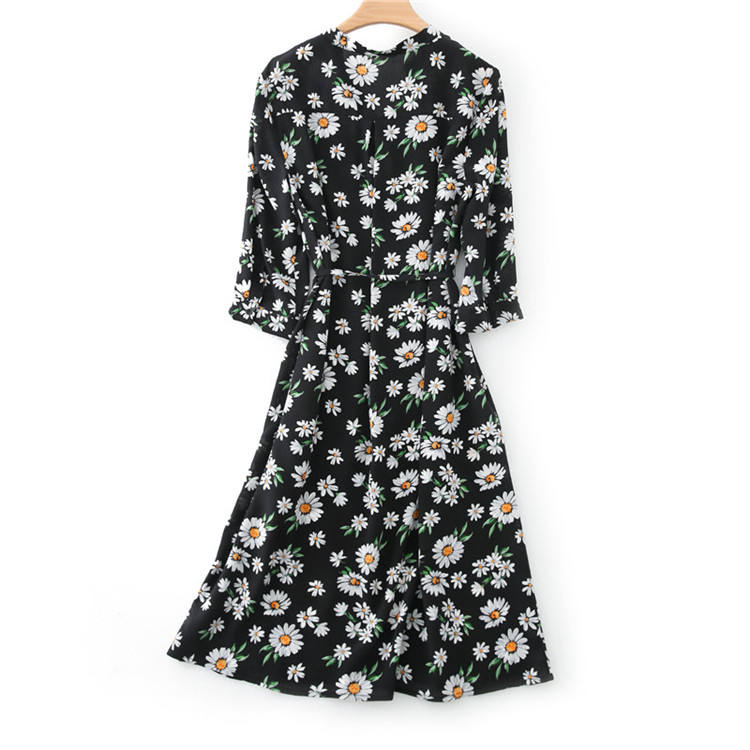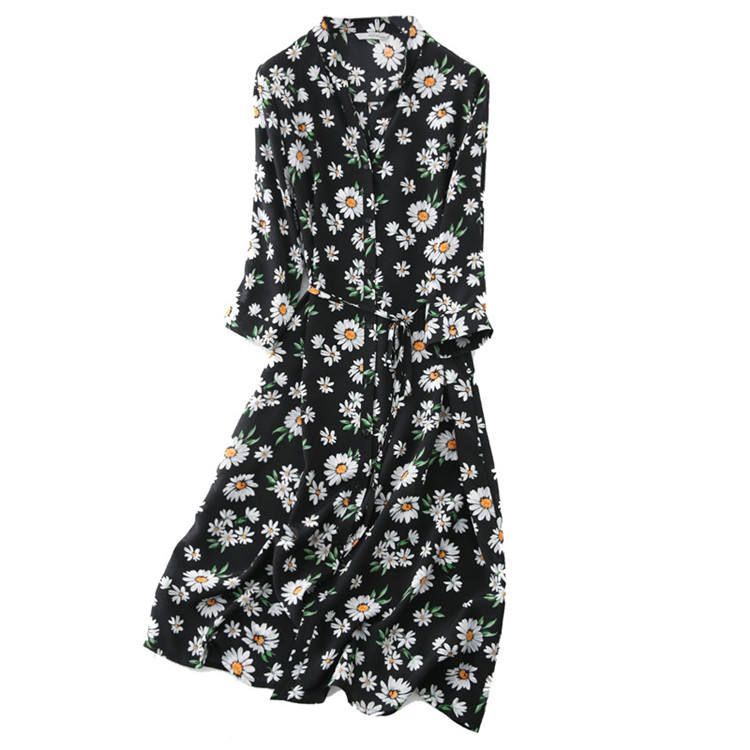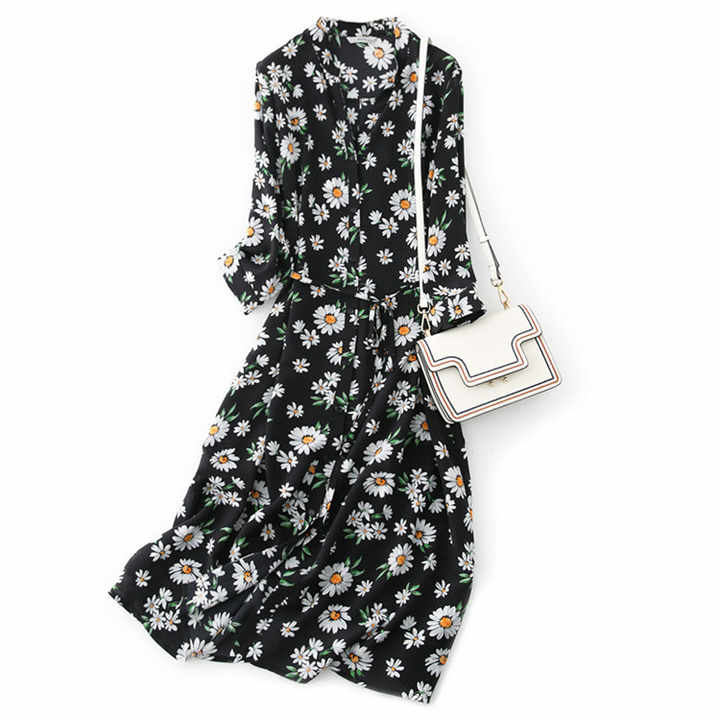 Abito Midi in Seta di Gelso con Stampa Margherita a Maniche Lunghe da Donna, con Cintura, Lusso Estivo 2024