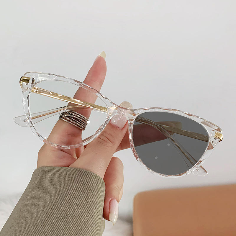 Occhiali Cat‑Eye vintage montatura cristallo multi‑taglio, lenti fotocromatiche, aste metalliche a molla, logo personalizzabile