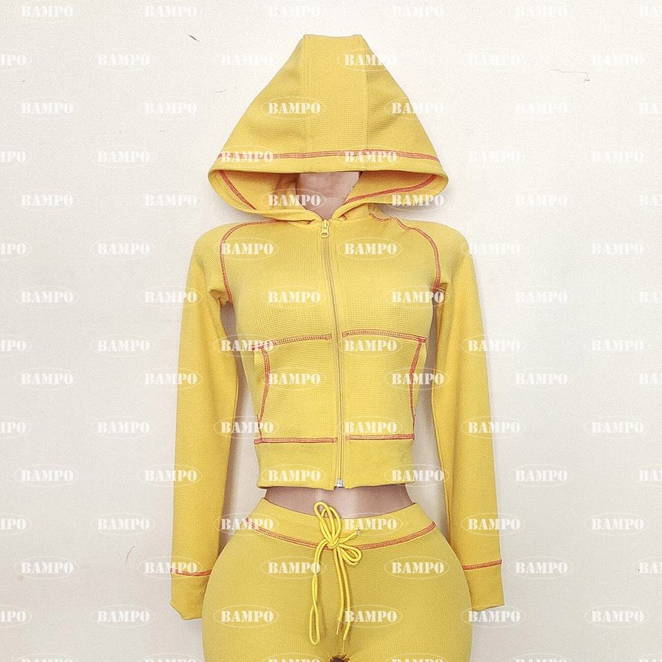 Qingdao Bamboo Pole Set donna 2 pz: felpa cappuccio e pantaloni a zampa in maglia waffle (cotone), personalizzabile, min 100 pz