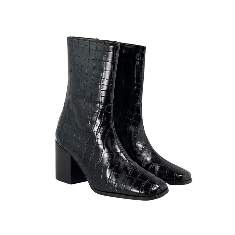 Stivali 2025 stile classico personalizzati in pelle vegana nera a punta quadrata a metà polpaccio con motivo a serpente invernale con tacco Midi Vegan da donna