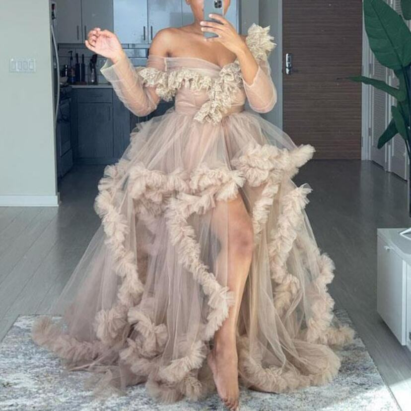 Abito lungo in tulle e mesh, maniche lunghe, scollo a V, gonna ampia a balze, taglia unica corta L88cm B126cm M28cm, cintura
