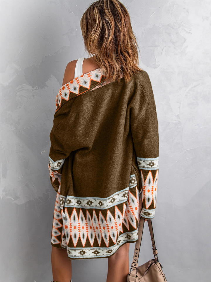 2025 autunno nuovi arrivi in stile azteco Vintage Open Front Cardigan lungo lavorato a maglia per donne Casual autunno geometrico
