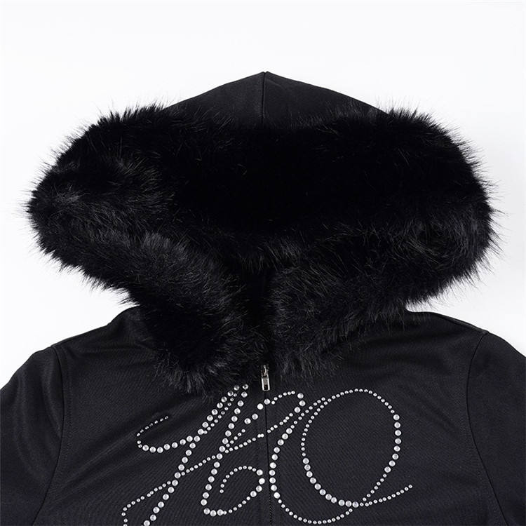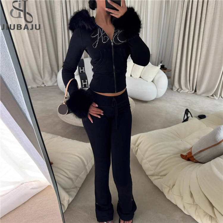 Jiubawu Set tuta 2pz 2025 Fall/Winter, giacca con cappuccio e zip + pantaloni a zampa, patchwork peloso con strass, taglie S-L