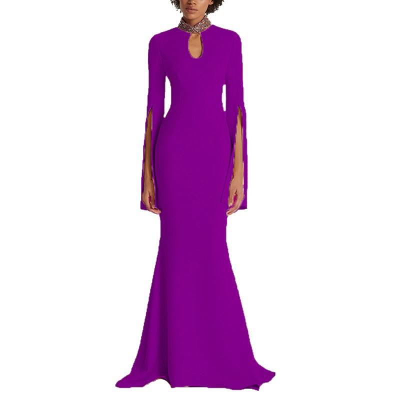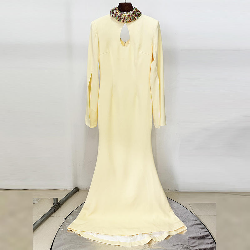Nuovo abito da sera giallo moda 2025 con colletto con perline con spacco a maniche lunghe formale