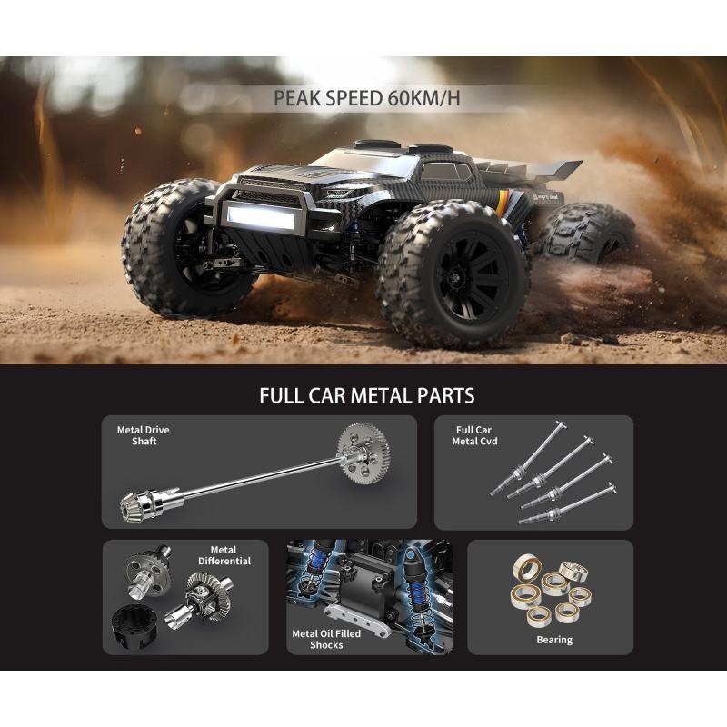 Costruzione interamente in metallo: La costruzione interamente in metallo aumenta la durata e la robustezza, rendendo l'auto RC adatta per condizioni estreme fuoristrada e prestazioni a lungo termine.