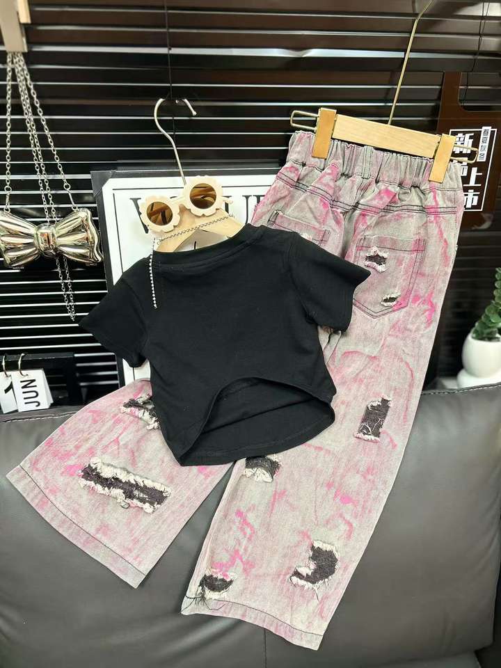 2025 New Arrival Children Clothes Set Summer Embroidered butterfly Short-sleeved T Shirt Trendy Ripped Jeans 2Pcs Girls Clothing