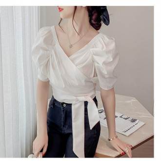 2025 New Arrival French Women's Summer White Casual Wrap Blouse V-Neck Shirt with Balloon Top Design