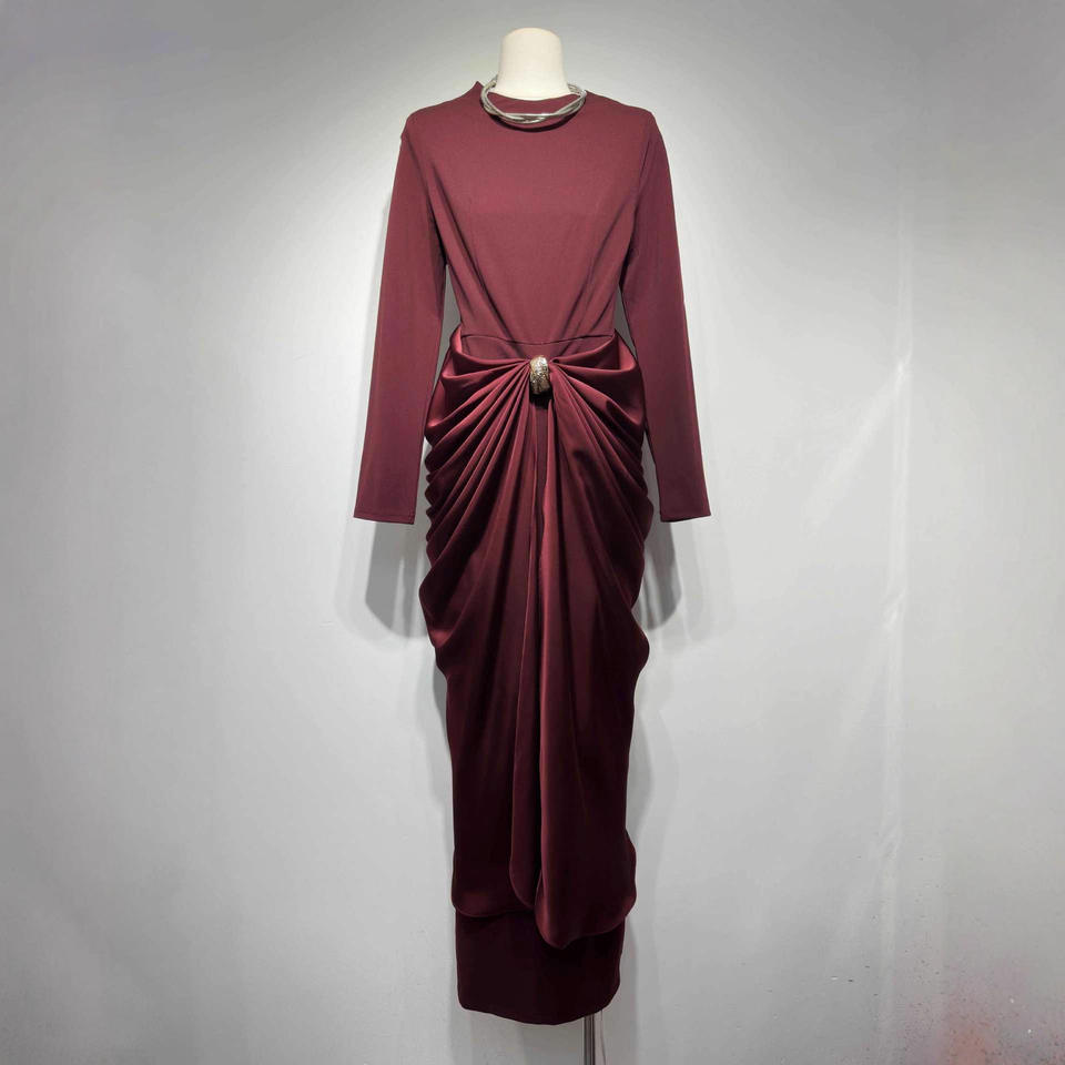 2025 New Arrivals Luxury Women's Irregular Hem Dress Round Neck Long Sleeve with Metal Buckles Elegant Evening Dresses for Women