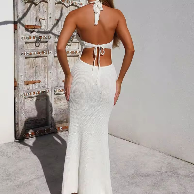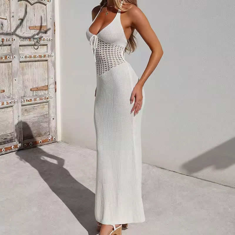 2025 nuovo Design primavera moda donna collo pendente Sexy scollato aperto dietro a maglia traforato abito prospettico