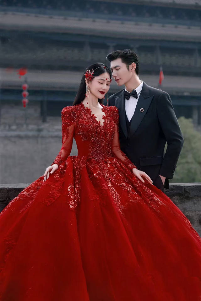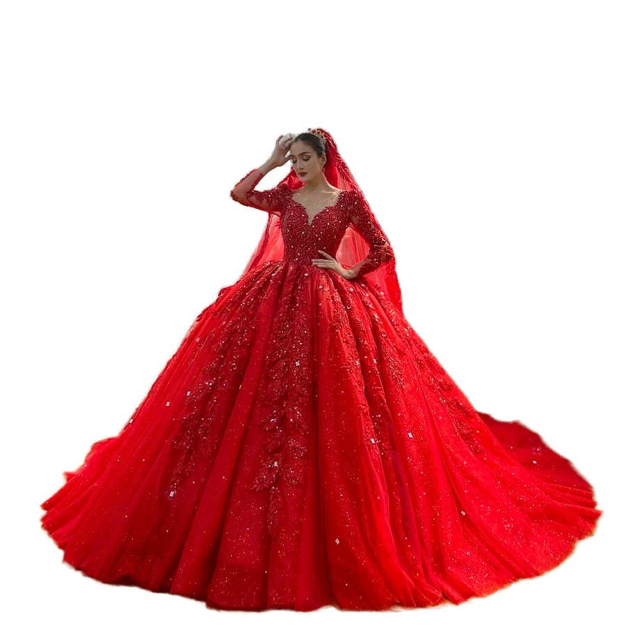 Nuovo Abito da Sposa Rosso in Pizzo 2025 con Grande Strascico, Stile Vintage Francese Invernale, Abito da Donna in Tulle Taglie Forti