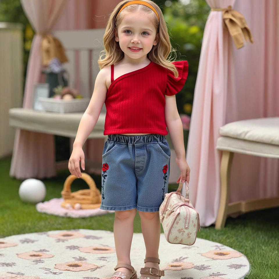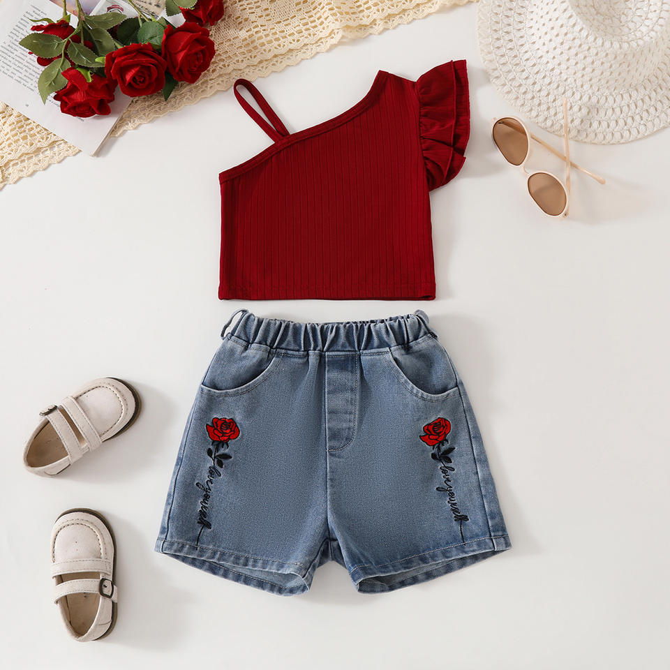 Keywords:Solid Pattern Red Vest and Hot Pants for Children Girls' Set
