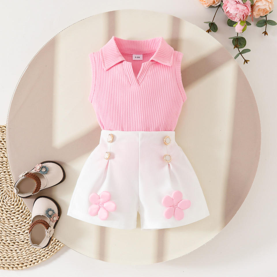2025 New Sweet Step Girl Sleeveless Collar Pit Strip Top with Stickers Button Shorts Summer Two Piece Set