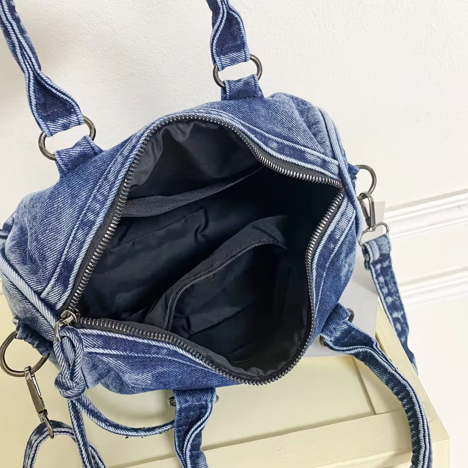 2025 New Vintage Denim Boston Bag Large Capacity Portable Crossbody Shoulder Bag for Women Travel Patchwork Zipper Design