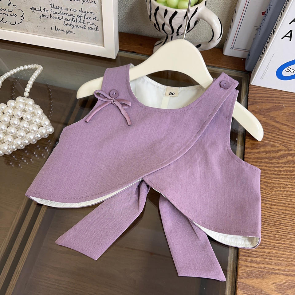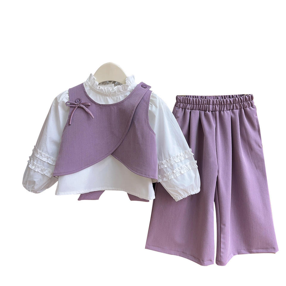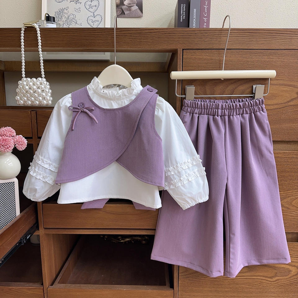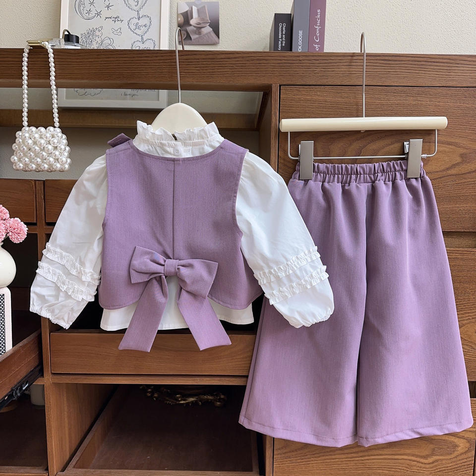 2025 primavera autunno nuove ragazze Set 3 pezzi gilet con rifiniture in pizzo pantaloni coordinati vestiti all'ingrosso per bambine