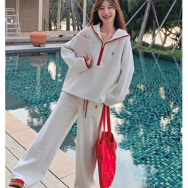 Set Micro ricamato rosso con taglio colorato Casual da donna primavera 2025: felpa oversize con cappuccio e pantaloni a gamba larga