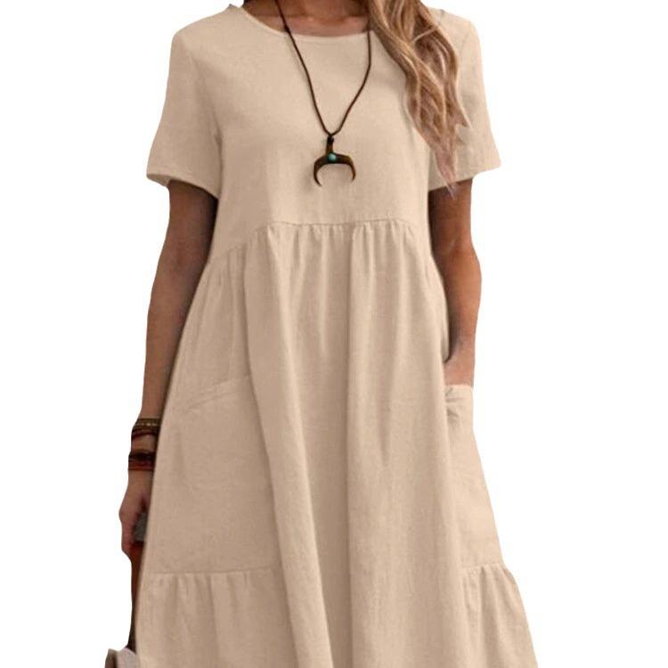 Abito Lungo da Donna Estivo 2025 Stile Retrò Europeo Americano Ampio con Tasche in Cotone e Lino Tinta Unita Stile Casual