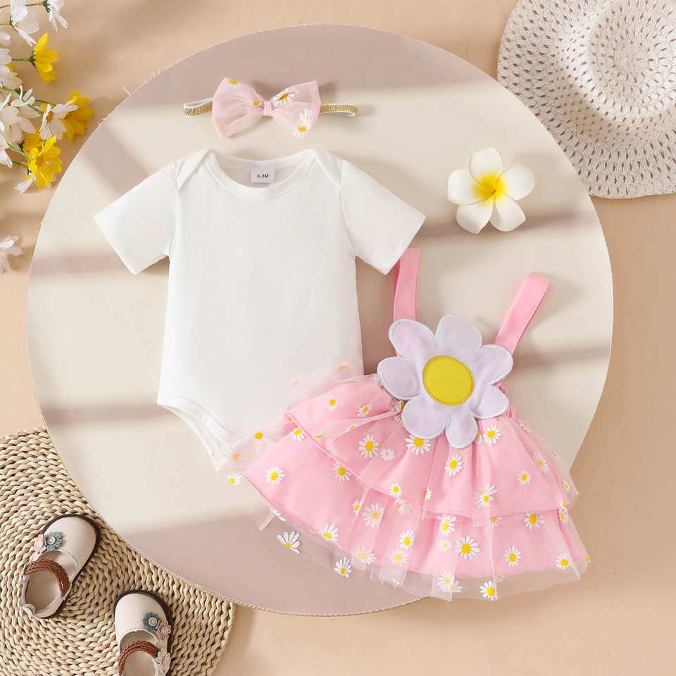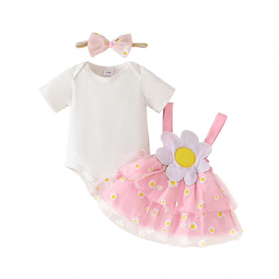 Set di Abbigliamento Estivo 2025 per Bambine: Top a Maniche Corte Tinta Unita, Gonna in Rete Stampata con Cintura e Fascia per Capelli, 3 Pezzi