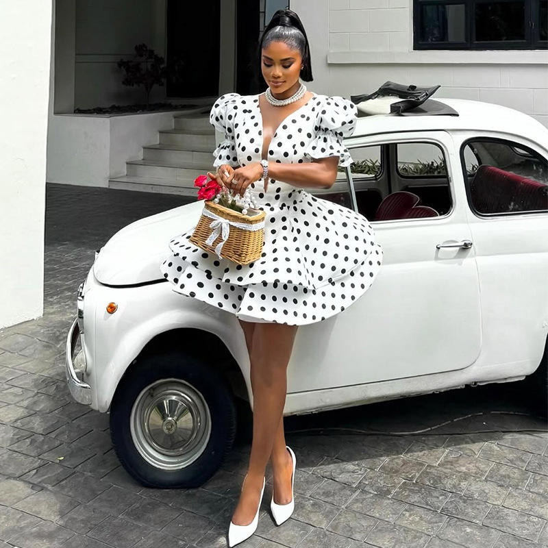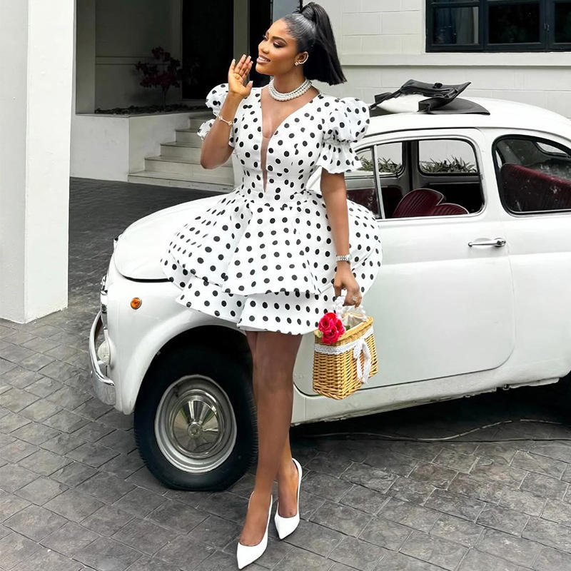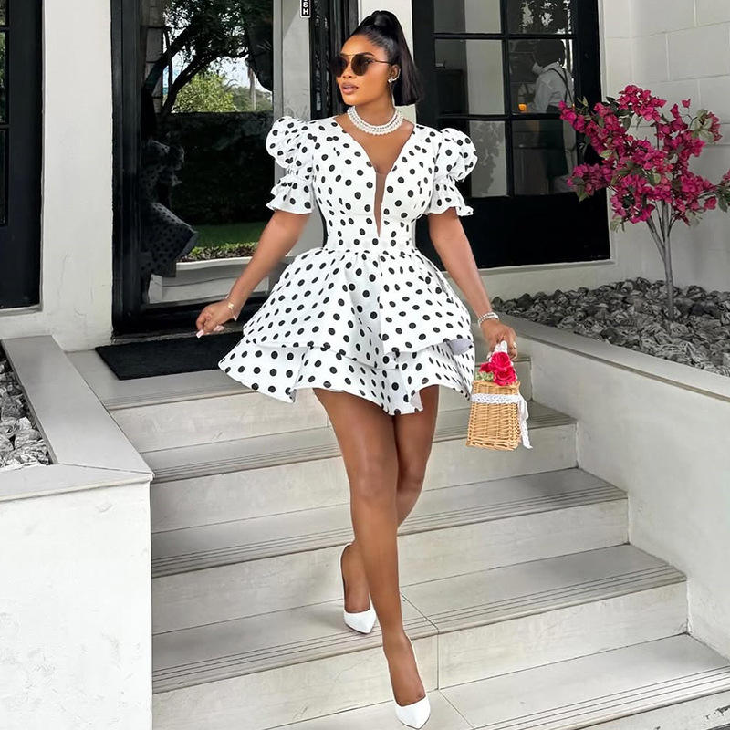 2025 Summer New Fashion Women's Casual Puff Sleeve V-Neck Polka Dot High Waist Anti-Static Polyester Irregular Dress