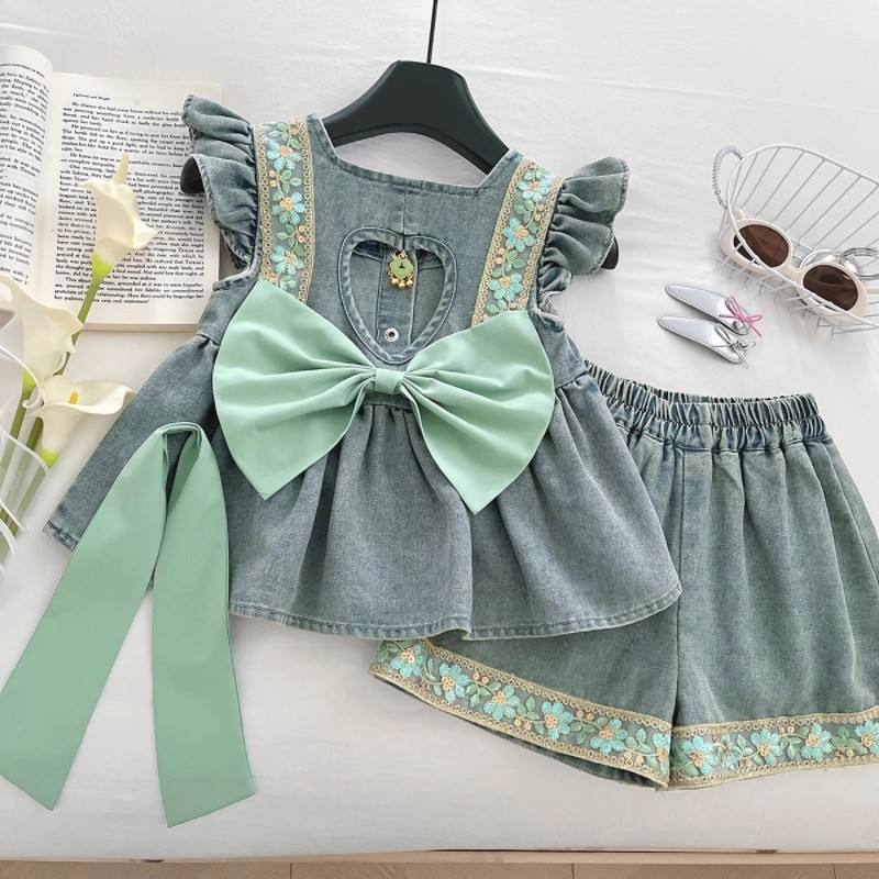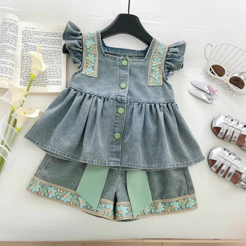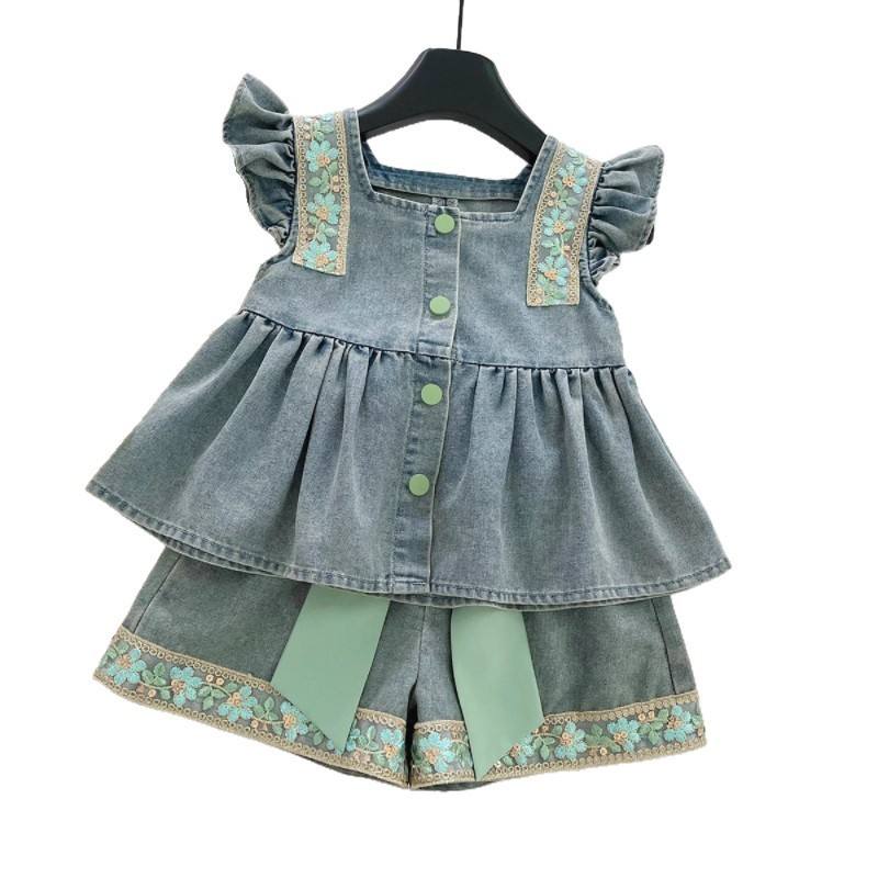 Completo Estivo 2025 per Bambine: Top in Denim con Maniche a Volant e Shorts in Denim - Prezzo all'Ingrosso Vantaggioso