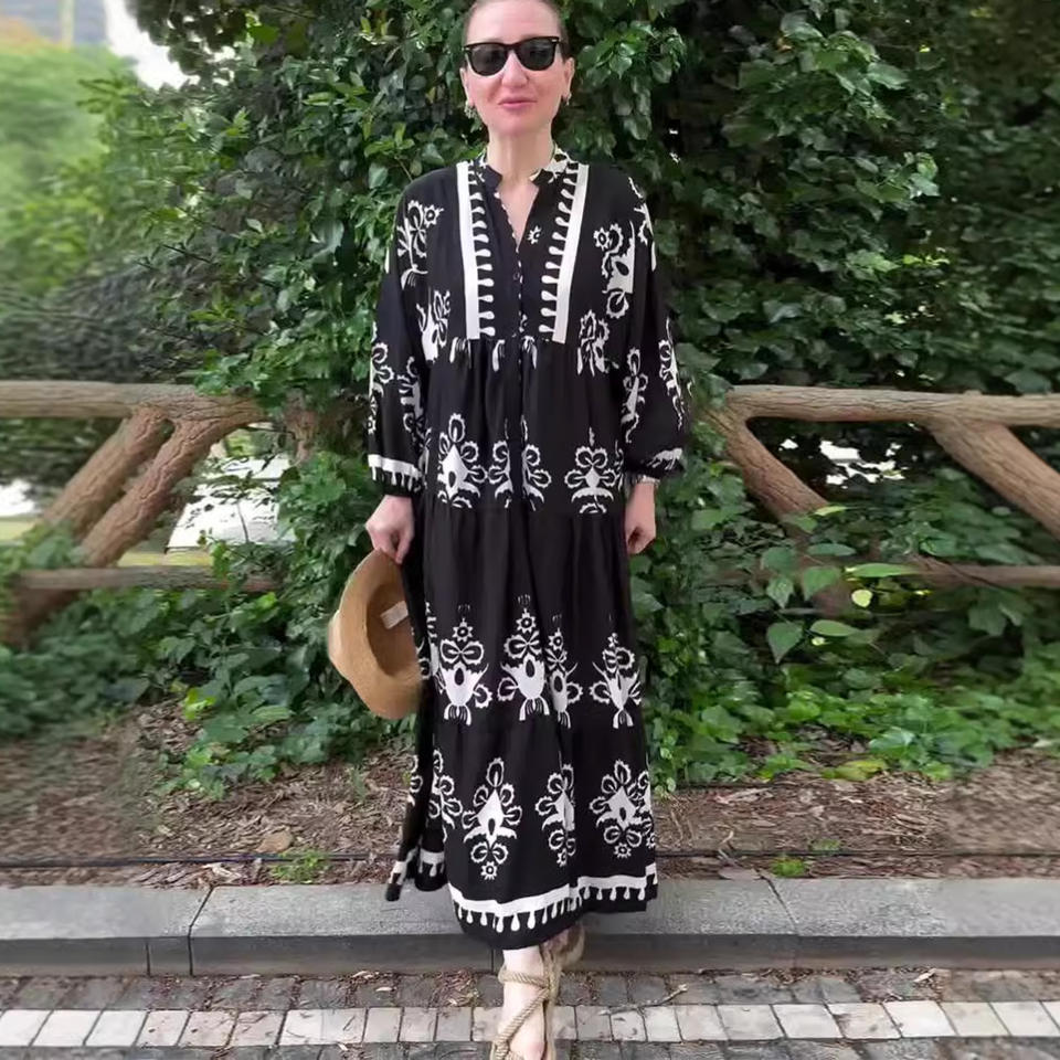 2025 Summer New Long-sleeved Long Skirt Casual Women's Pullover Printed Retro Pattern Dress Traditional Muslim Clothing