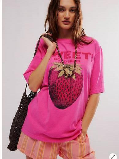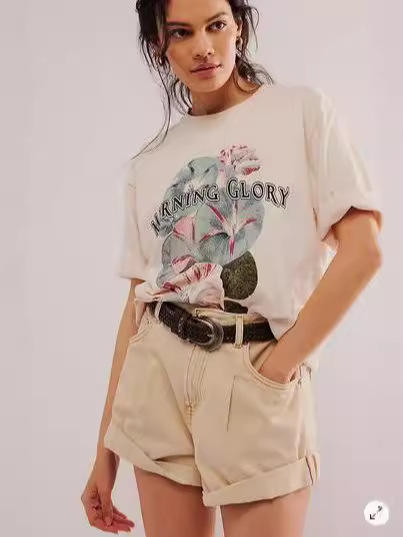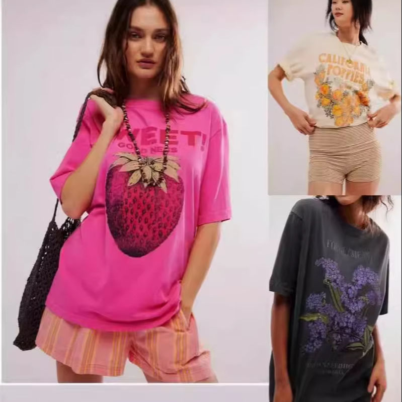 2025 Summer New Women's Retro T-Shirt Europe US Printed Flowers Loose Fit Oversize Fruit Print Pattern T-shirts