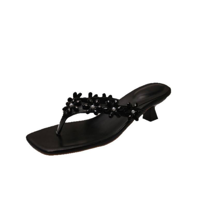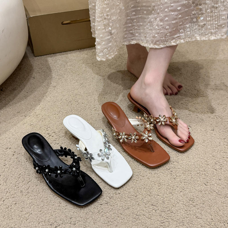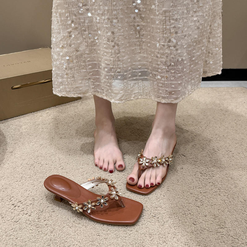 2025 Summer Square Toe Rhinestone Outwear Sexy Low Heel Slippers Women's New Arrival Plus Size Flip-flops Elegant Sandals 43