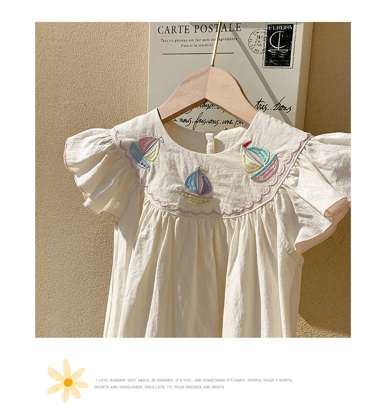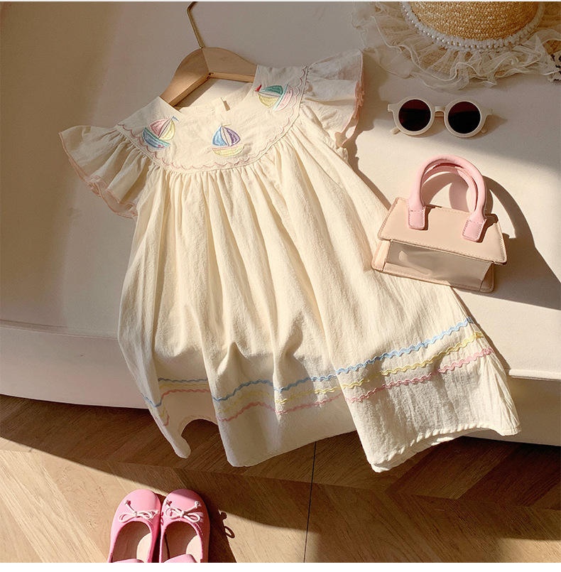 2025 Trendy Girls' Navy Dress Summer Rainbow Sailboat Embroidery Flying Sleeves Knee-Length Wholesale Kids Clothing Hot Sale