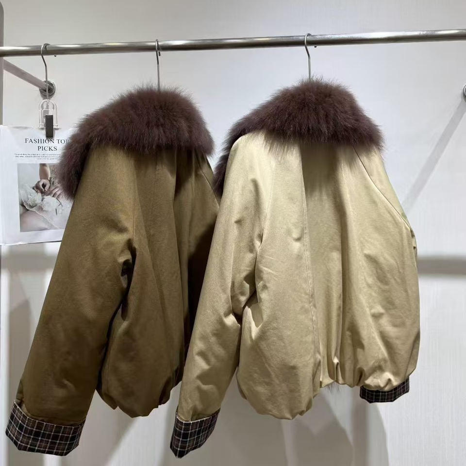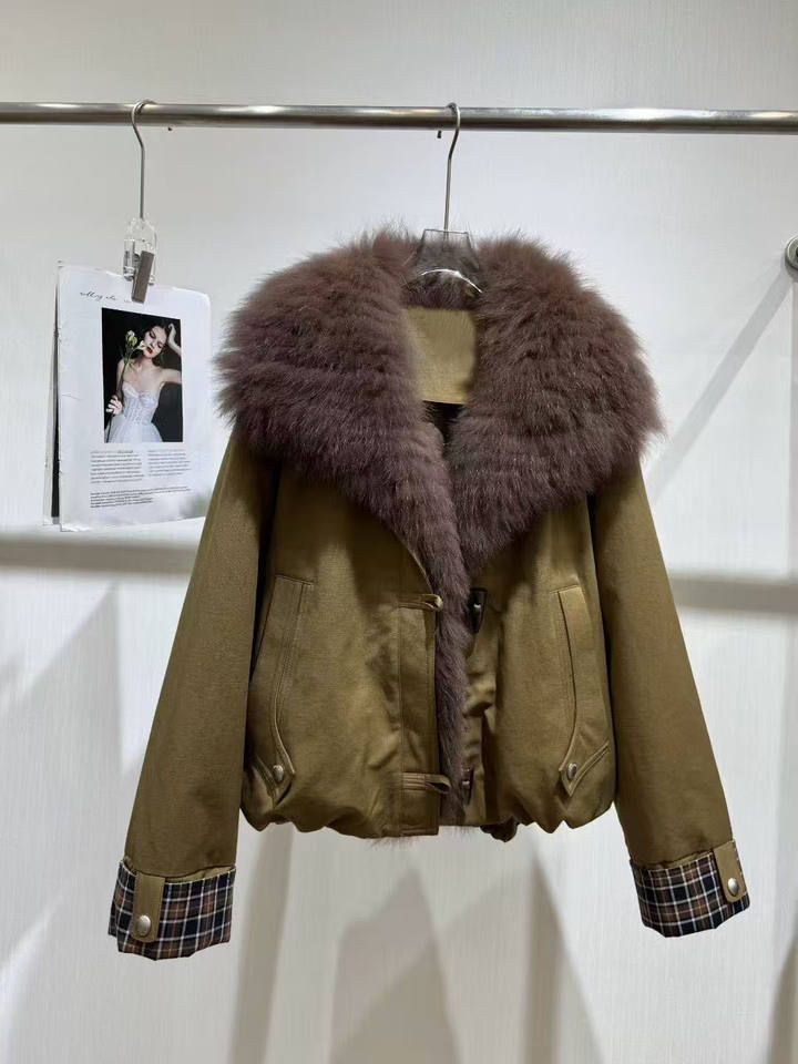 Nuovo Stile Moda Inverno 2025: Cappotto in Pelliccia di Coniglio con Interno in Piuma d'Oca per Donne, Parka Corto con Colletto Blu Navy, Giacca con Cerniera in Poliestere
