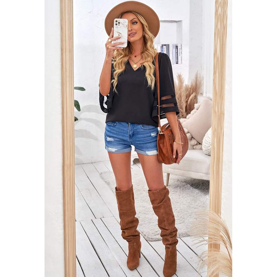 2025 Women's Casual V Neck Blouse 3/4 Bell Sleeve Mesh Panel Shirts Loose Top XL Ruffled Lace Chiffon Knitted for Office