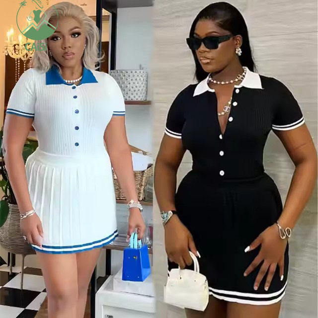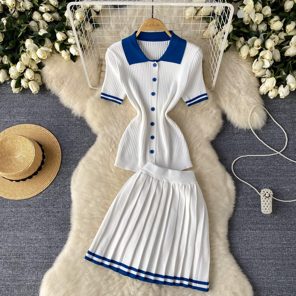 2025 Women's Clothing 2 Piece Skirt Set Summer Street Wear Short Sleeve Knitted T-shirt and Mini Pleated Skirt Set For Lady