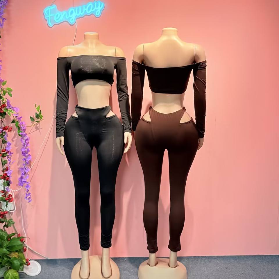 2025 Y2K Women's Off-Shoulder Long Sleeve Crop Top with Sheer Panel & Skinny Fit Pants Set Sexy Two Piece Outfit