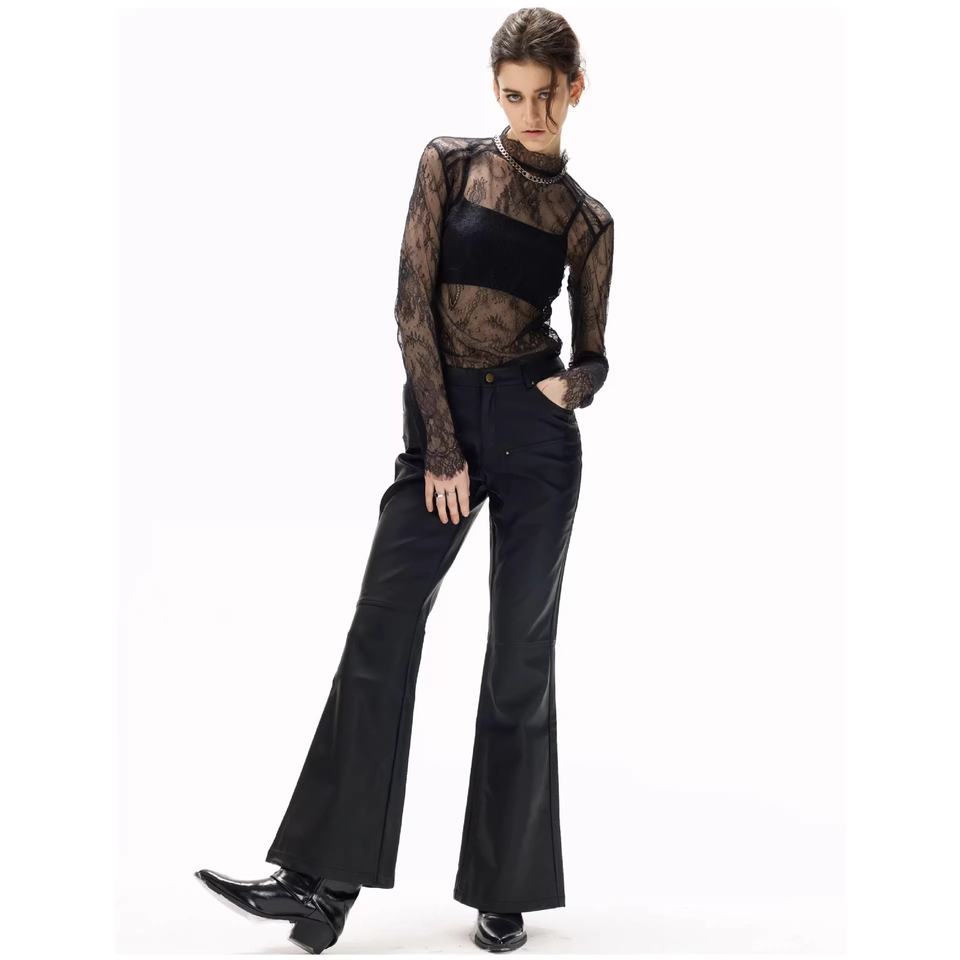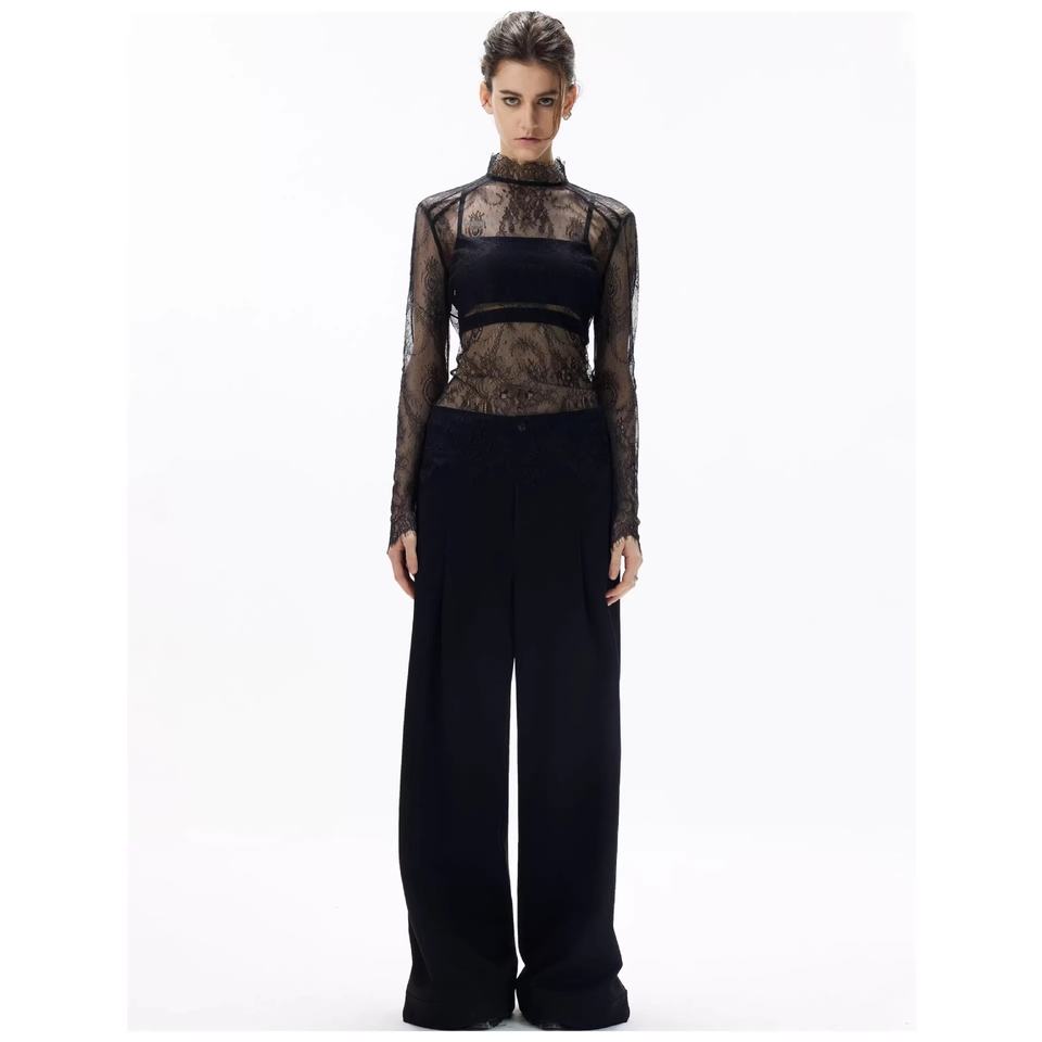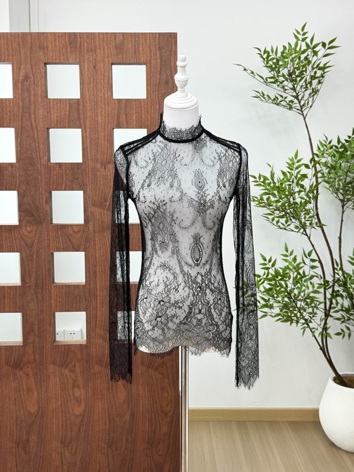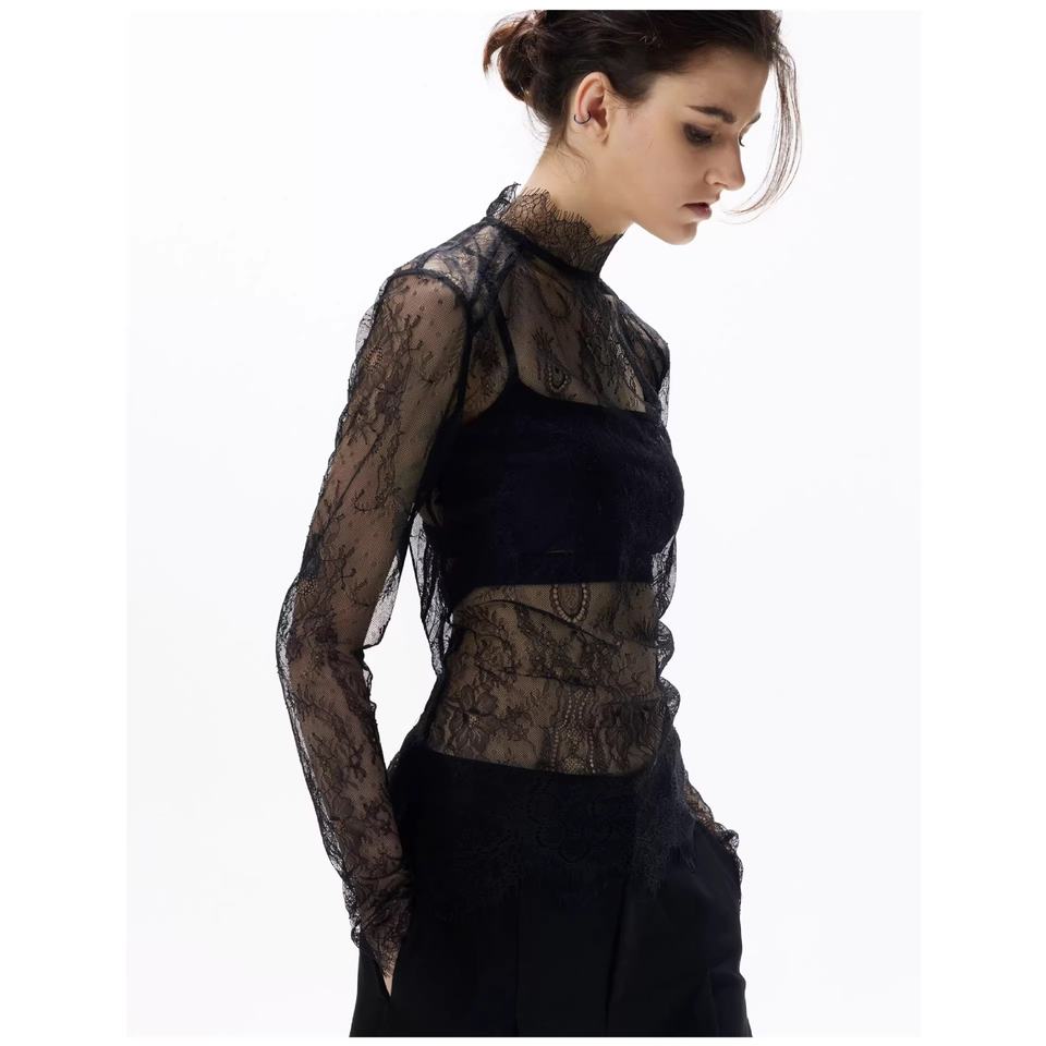 Camicia Nera 2026 in Poliestere con Base in Pizzo, Vestibilità Slim, Trasparente, Sexy, con Strati di Tulle, Maniche Lunghe e Collo Semi-Alto
