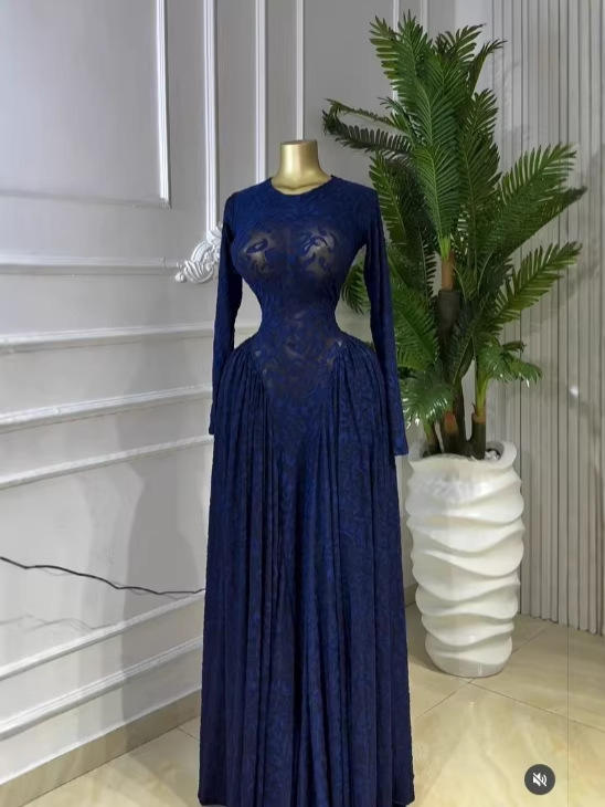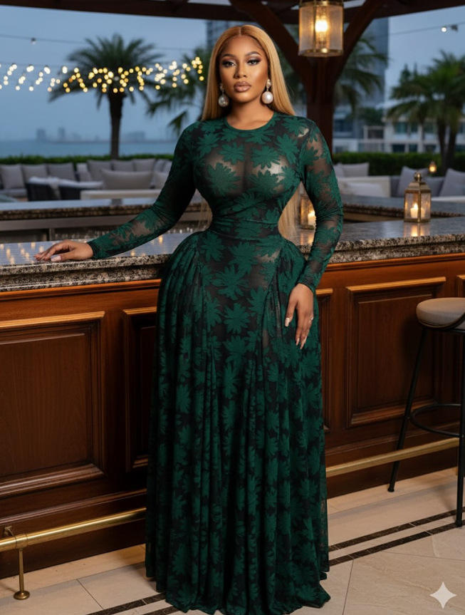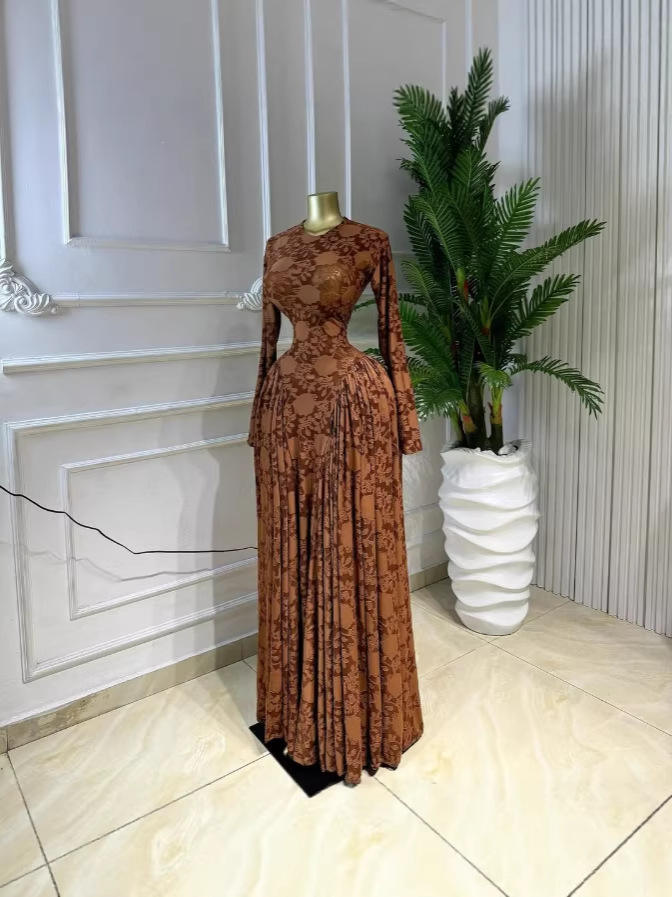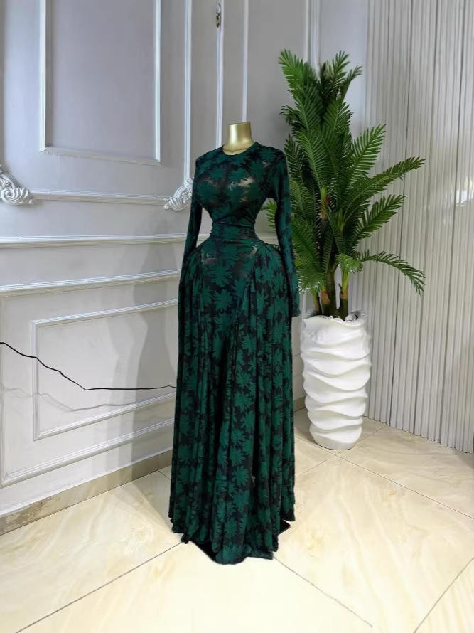 Abito Elegante Stampato 2026 con Maniche Lunghe in Rete e Schiena Scoperta per un Look da Spiaggia Include un strato interno.