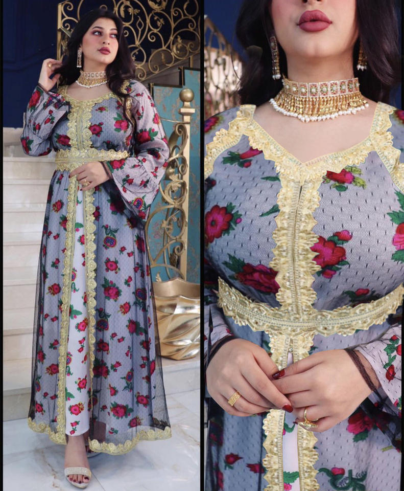 Abito Lungo Etnico Stile Medio Orientale 2026 con Stampa, Ricamo in Pizzo e Rete, Moda Musulmana di Lusso Dubai