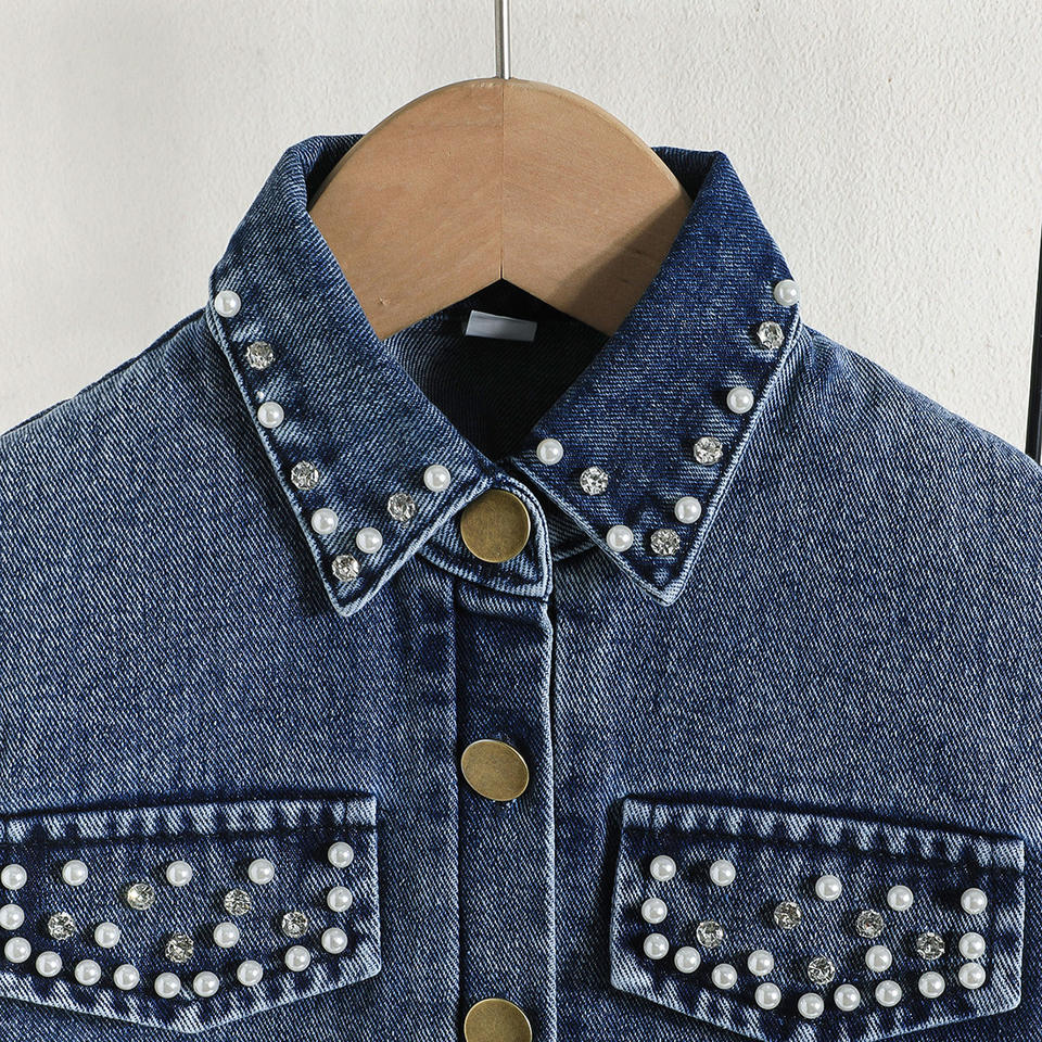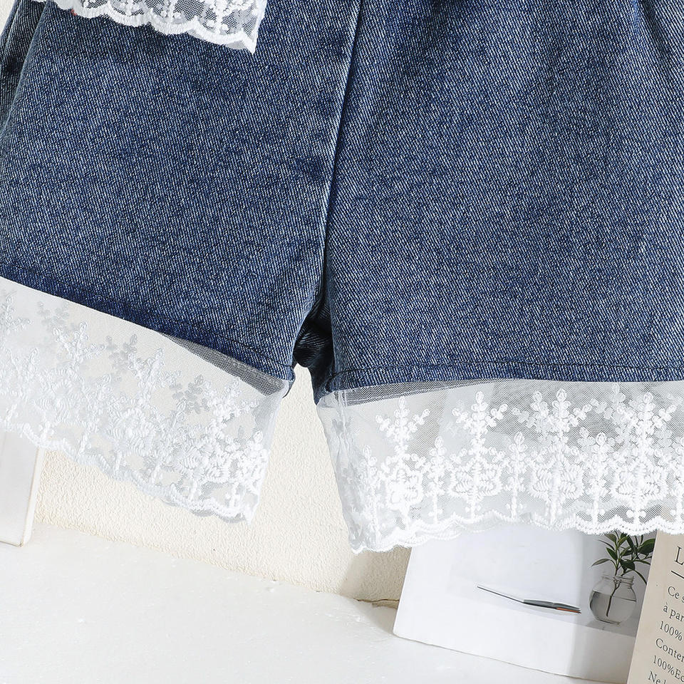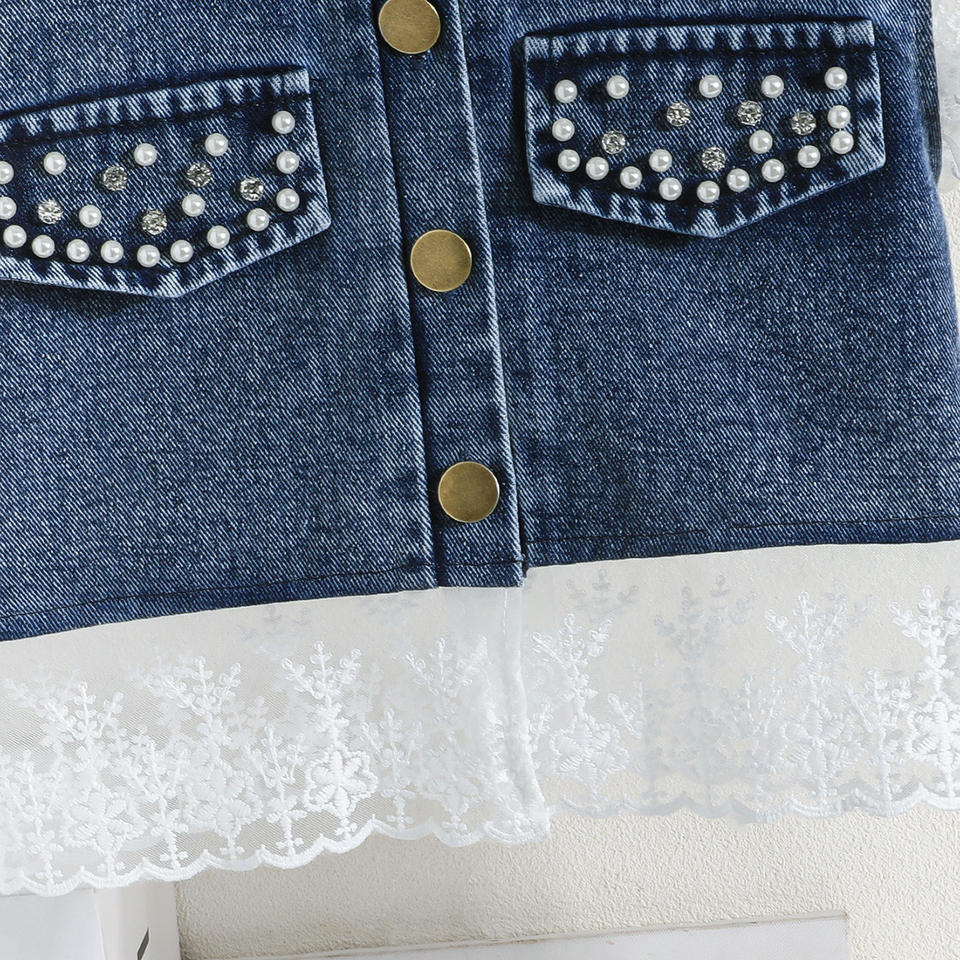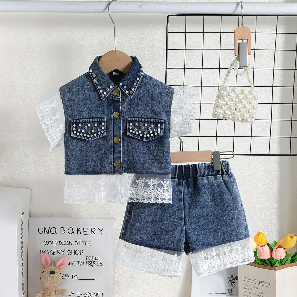 Completo in denim da bambina 2026 con gilet e pantaloncini decorati con pizzo e perline - Abbigliamento elegante e di tendenza per bambine 2-8 anni