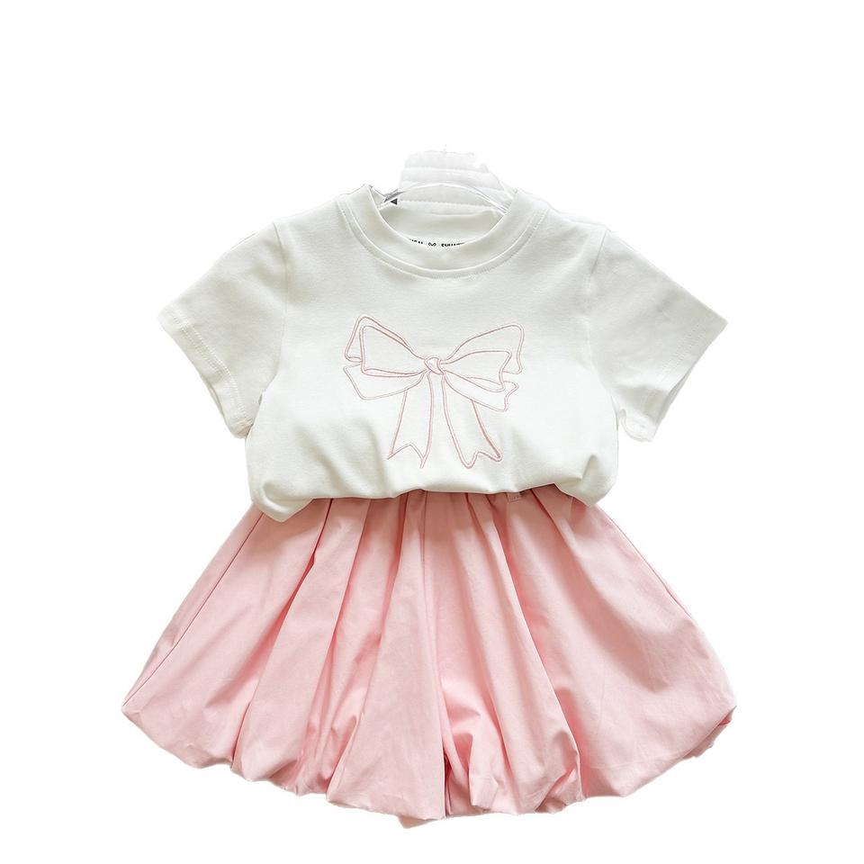 Completo Estivo 2026 per Ragazze: Nuovo Set Due Pezzi Casual con T-shirt a Maniche Corte Ricamata con Fiocco e Pantaloncini a Bocciolo Floreale
