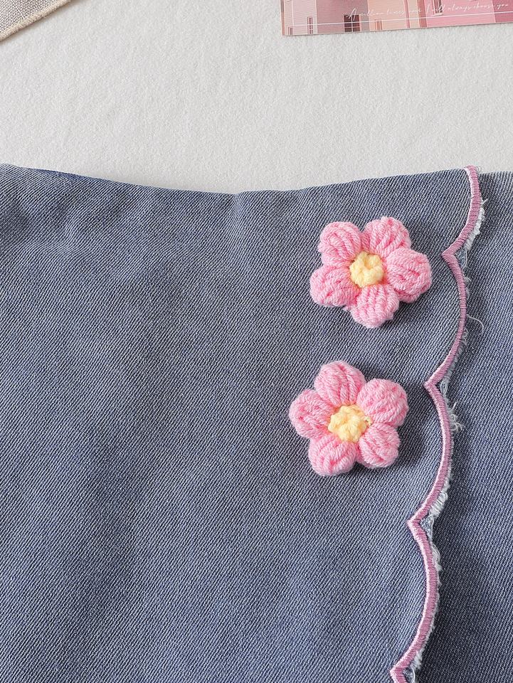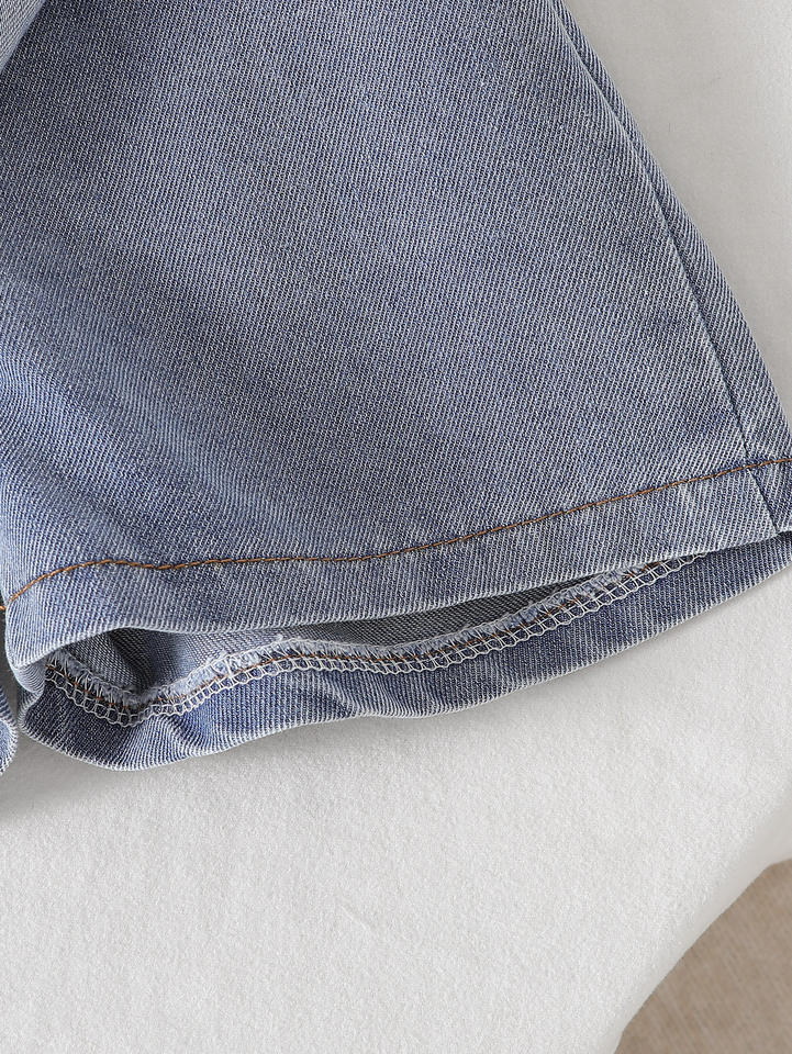 Completo da bambina 2026 in stile western: Top a righe con risvolto e pantaloncini in denim con orlo floreale ricamato irregolare - Abbigliamento per bambine