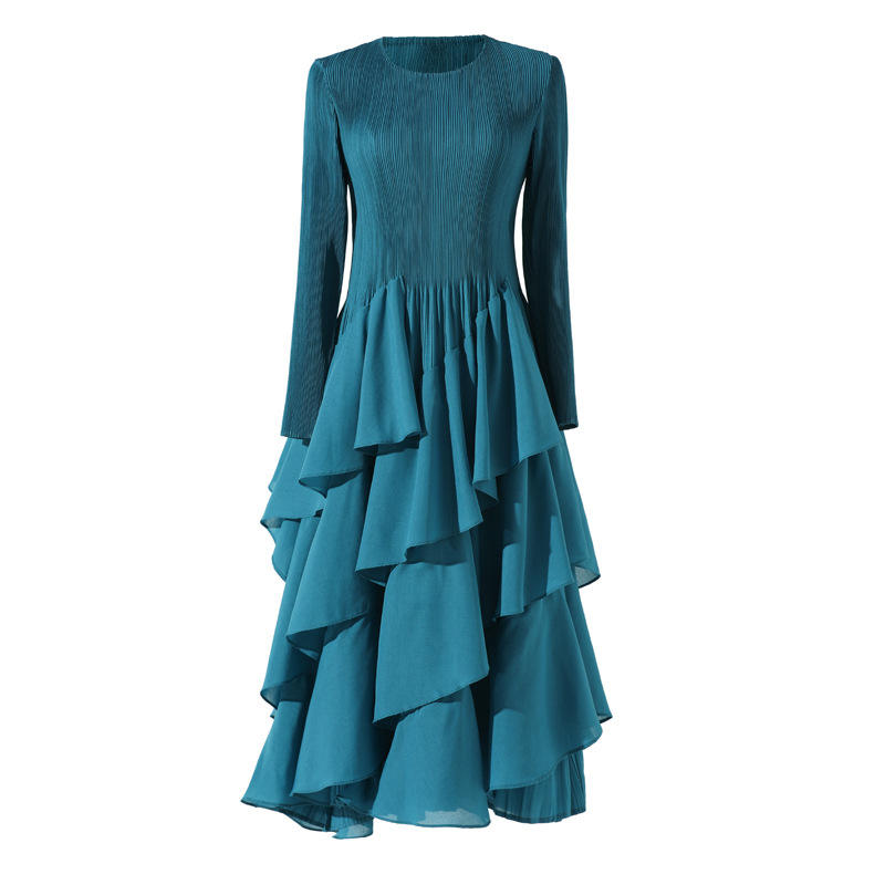 2026 Hot Selling Ladies Casual Pleated Stretch Loose Round Neck Long Sleeve Pleated Cake Dress