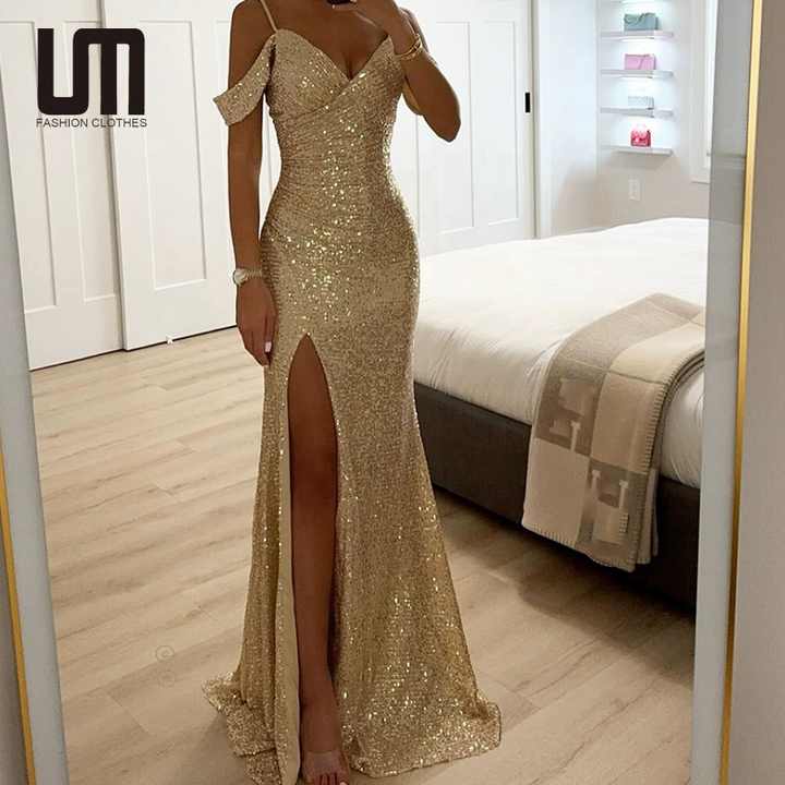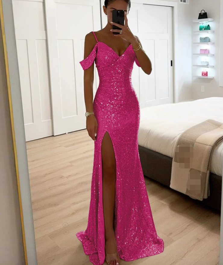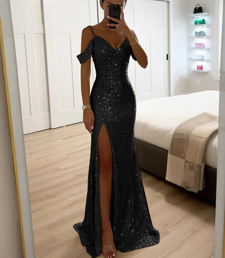 Abito da sera elegante da donna 2026 con scollo a V e paillettes lucide - Vestito lungo slim fit a tinta unita con spacco, perfetto per le serate