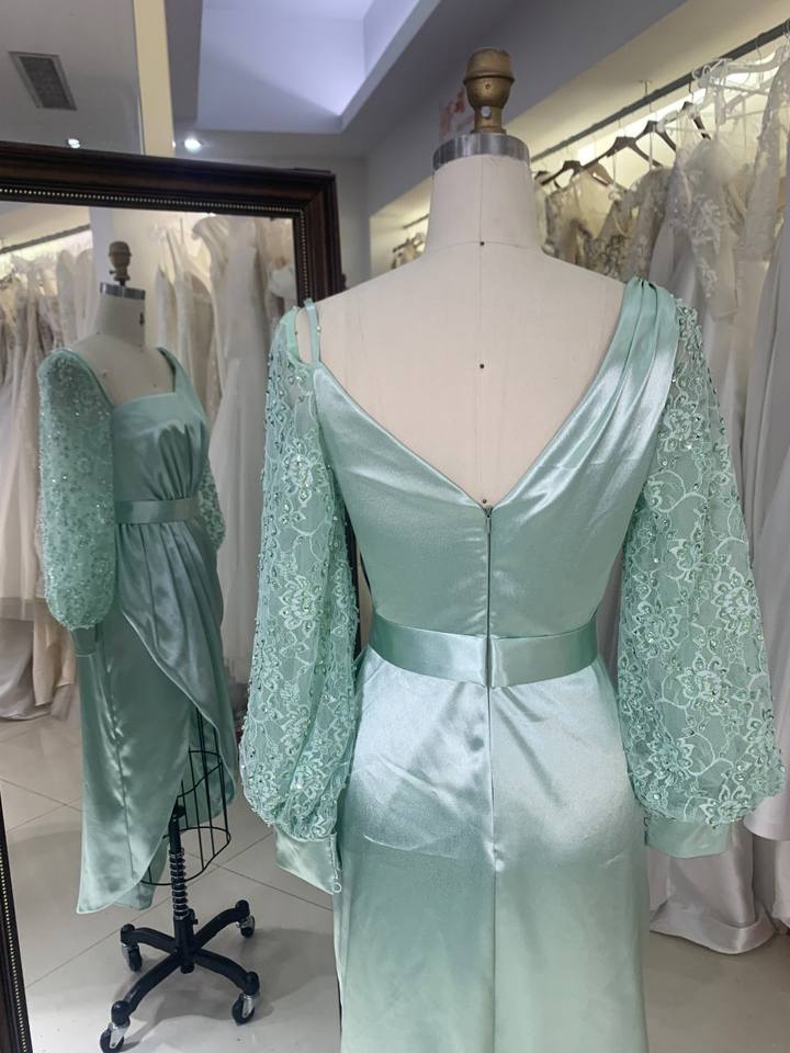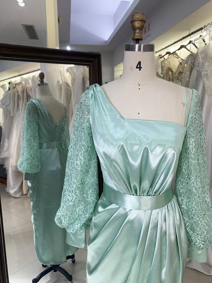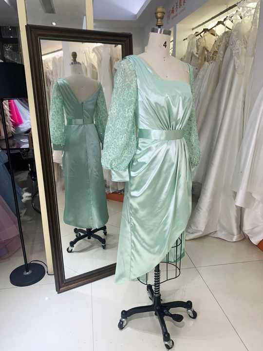 2026 Mint Green Satin Elegant Asymmetric Neck Evening Party Dress Long Sleeves Waist Slit Knee Length Sequined Draped Decoration