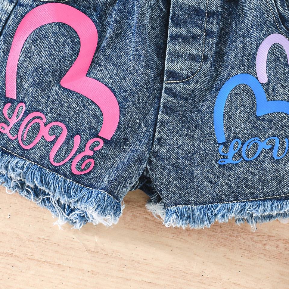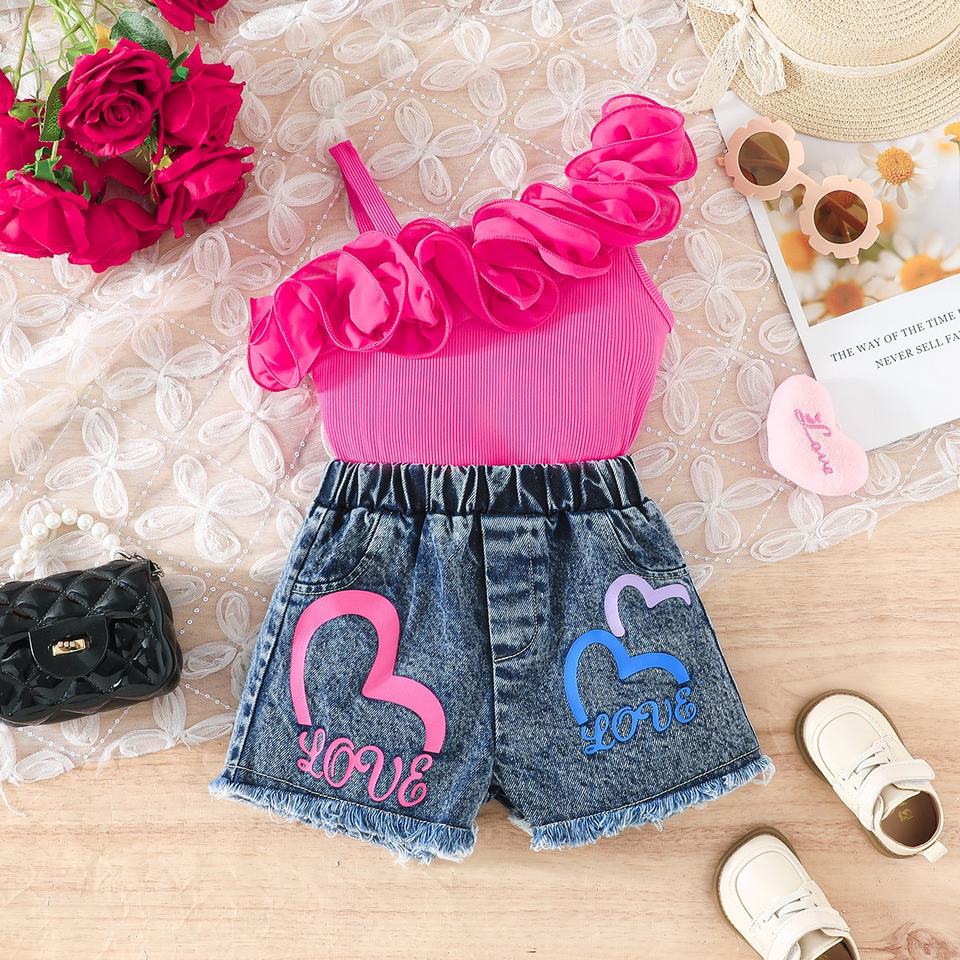 Nuovi Arrivi 2026: Set Casual per Bambine con Top Monospalla e Shorts in Denim con Stampa a Cuori
