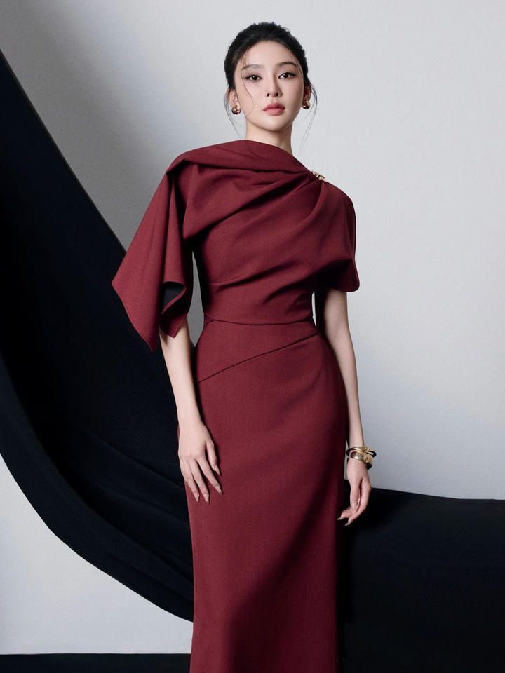 Novità 2026: Abito Scialle dal Design Ricercato con Fibbia Metallica, Spacco e Vestibilità Aderente in Bordeaux.
