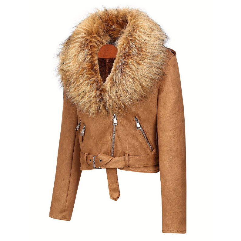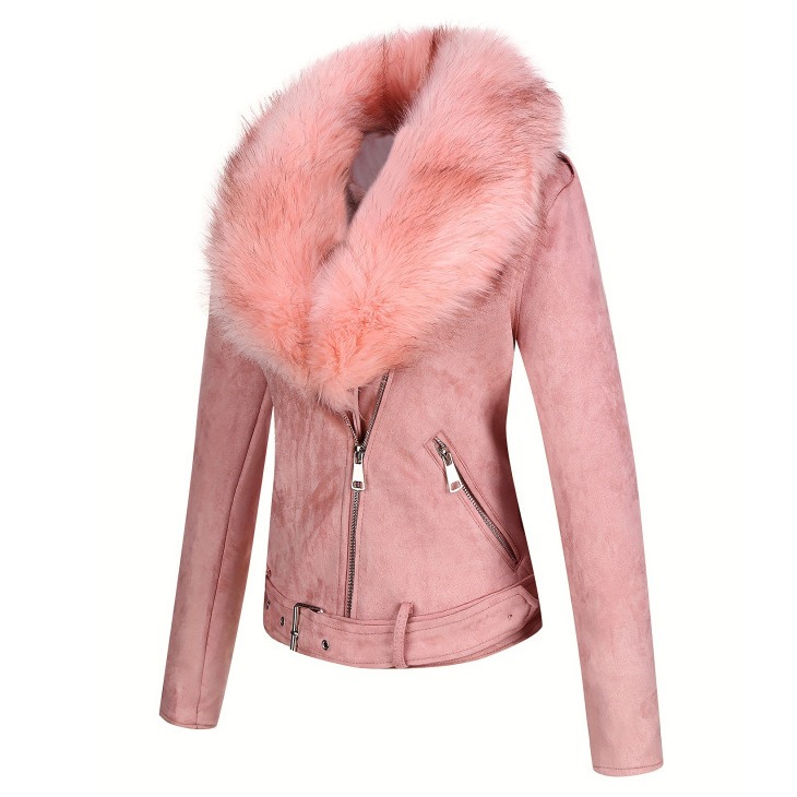 2026 New Arrival Women's Winter Fur Hooded Crop Suede Leather Motorcycle Jacket Wholesale Slim Elegant Breathable Finished