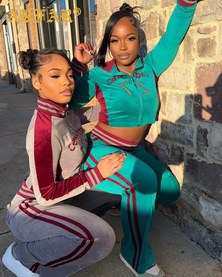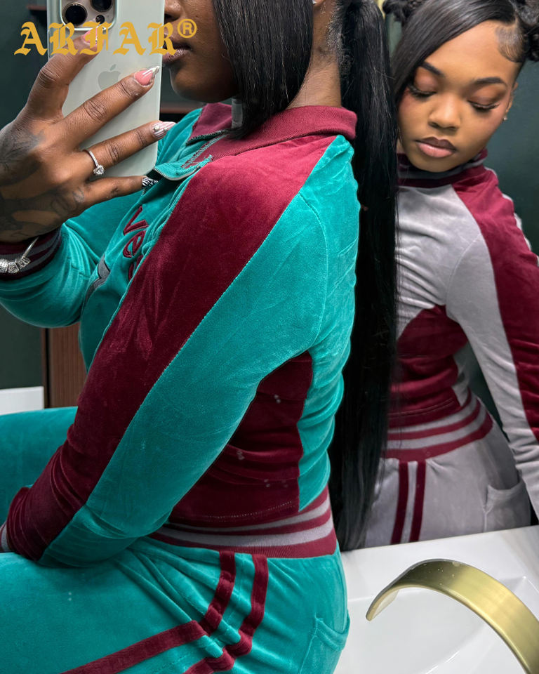 2026 New Arrivals Velvet Tracksuit Women Set Color Blocking Ribbed Turndown Collar Jacket Jogger Pants Y2k Clothing Women