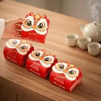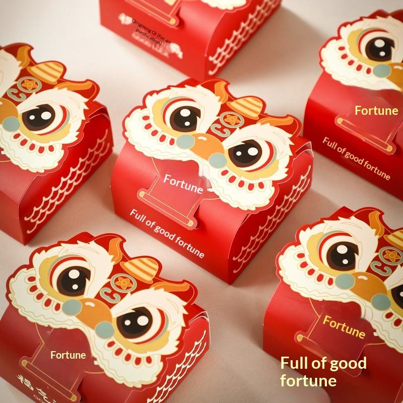 2026 New Year Small Folding Gift Box Lion Dance Chinese Character 'Fu' White Cardboard Rectangular Eco-Friendly Embossing