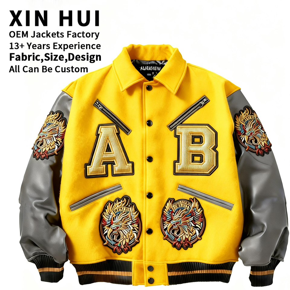 Giacca Varsity Personalizzata OEM 2026 con Maniche in Pelle e Toppe in Ciniglia, Giacche Bomber College all'Ingrosso