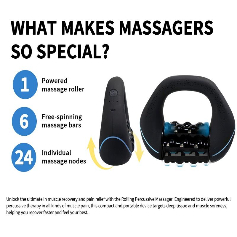 6 rotoli vibranti: Dotato di sei rotoli vibranti, questo massaggiatore offre un sollievo muscolare profondo ed efficace su diverse parti del corpo.